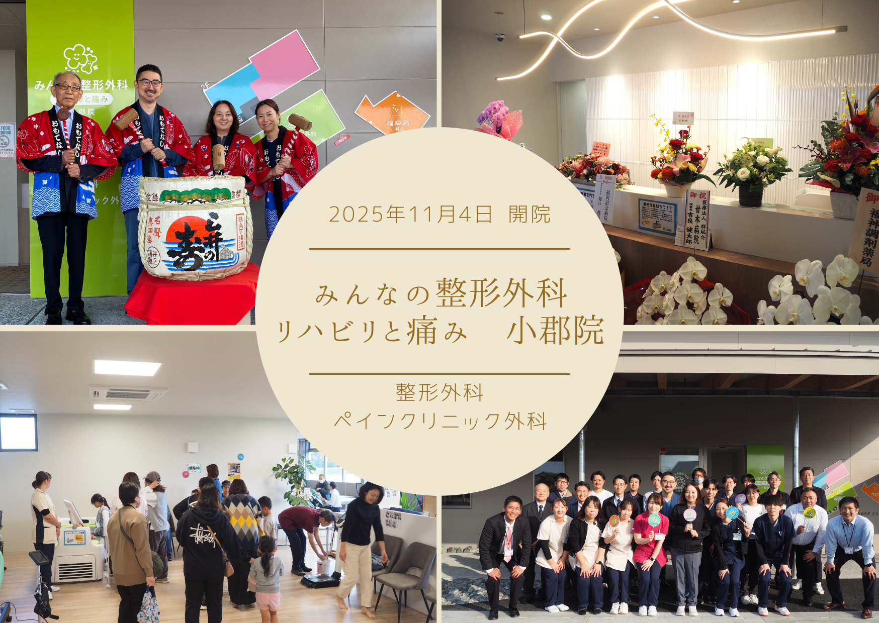 11月4日(火)に小郡市大板井にて『みんなの整形外科 リハビリと痛み 小郡院』が開院しました。開院に先立ち、11月2日(日)に内覧会を開催しましたが、たくさんの方にご来場いただき誠にありがとうございました。当クリニックは、整形外科・ペインクリニックを中心に診療を行っていきます。小郡市及び近郊の皆様の健康を守るため日々精進していきますので、今後とも何卒よろしくお願いいたします。 2025.11.04